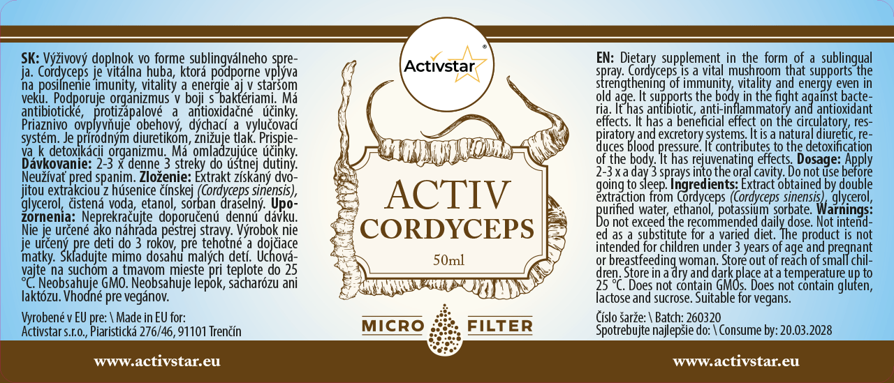 ACTIV CORDYCEPS ist ein Nahrungsergänzungsmittel in Form eines sublingualen Sprays, das einen Extrakt aus dem Vitalpilz Cordyceps sinensis enthält. Dieser wertvolle Pilz ist bekannt für seine Wirkung zur Stärkung der Immunität, zur Erhöhung der Vitalität und Energie und zur Unterstützung des allgemeinen Zustands des Körpers.
