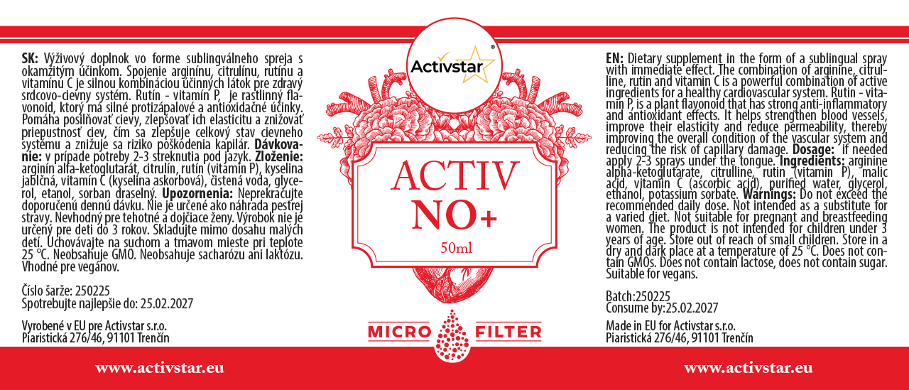 ACTIV NO+ ist ein Nahrungsergänzungsmittel in Form eines sublingualen Sprays mit sofortiger Wirkung. Die Kombination aus Arginin, Citrullin, Rutin und Vitamin C ist eine äußerst leistungsstarke Wirkstoffkombination, die die Gesundheit der Blutgefäße, die Mikrozirkulation und die allgemeine Fitness des Herz-Kreislauf-Systems unterstützt.