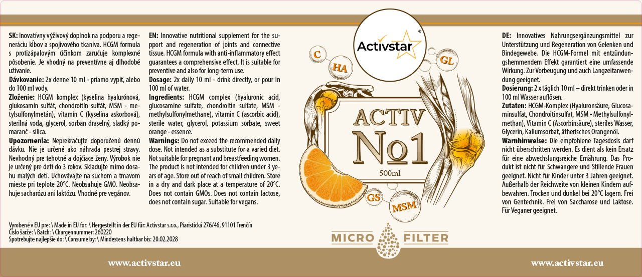 ACTIV No1 ist ein innovatives flüssiges Nahrungsergänzungsmittel zur Unterstützung der Gelenke, der Knorpelregeneration und der Ernährung des Bindegewebes. Es enthält einen hochwirksamen HCGM-Komplex (Hyaluronsäure, Glucosamin, Chondroitin, MSM), ergänzt durch Vitamin C, das zur Bildung von Kollagen für eine gute Knochen- und Knorpelfunktion beiträgt.