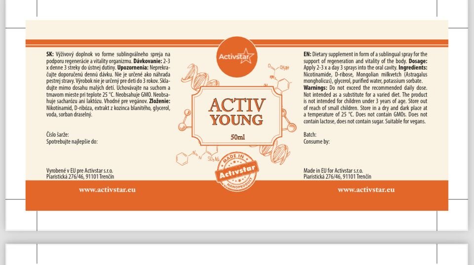 Activ YOUNG ist ein Nahrungsergänzungsmittel in Form eines sublingualen Sprays, das die Zellerneuerung, Vitalität und Energie des Körpers unterstützt. Dank seiner einzigartigen Zusammensetzung wirkt es schnell und effektiv – es wird direkt in der Mundhöhle aufgenommen.